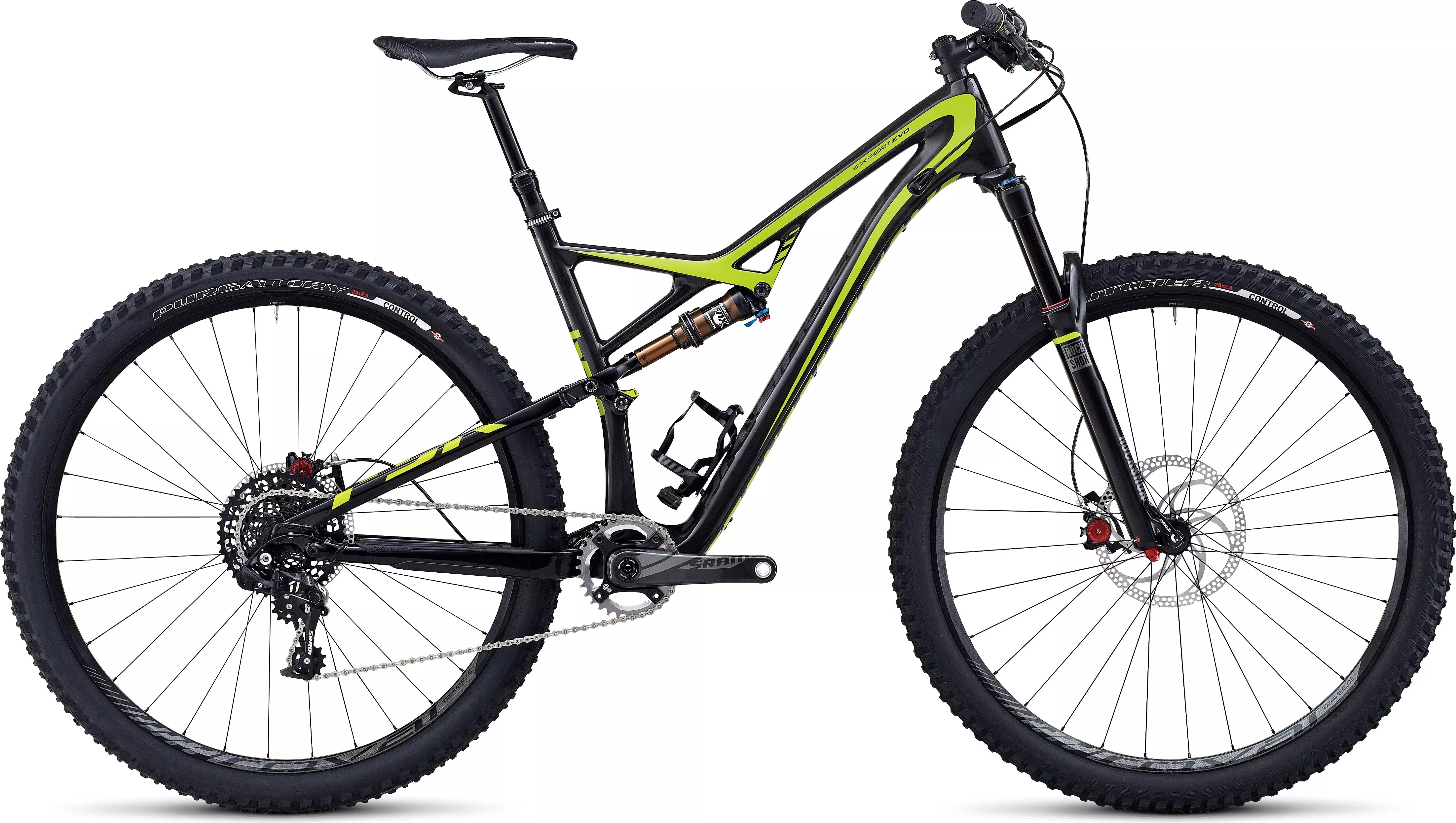 Built with a competition-specific component spec, the 120mm-travel Camber FSR Expert Carbon EVO features a RockShox Pike RC fork with a tapered steerer, a custom-tuned Fox Float CTD Performance shock, and custom SRAM carbon S-2200, 11-speed XC Trail double crankset with PF30 spindle.