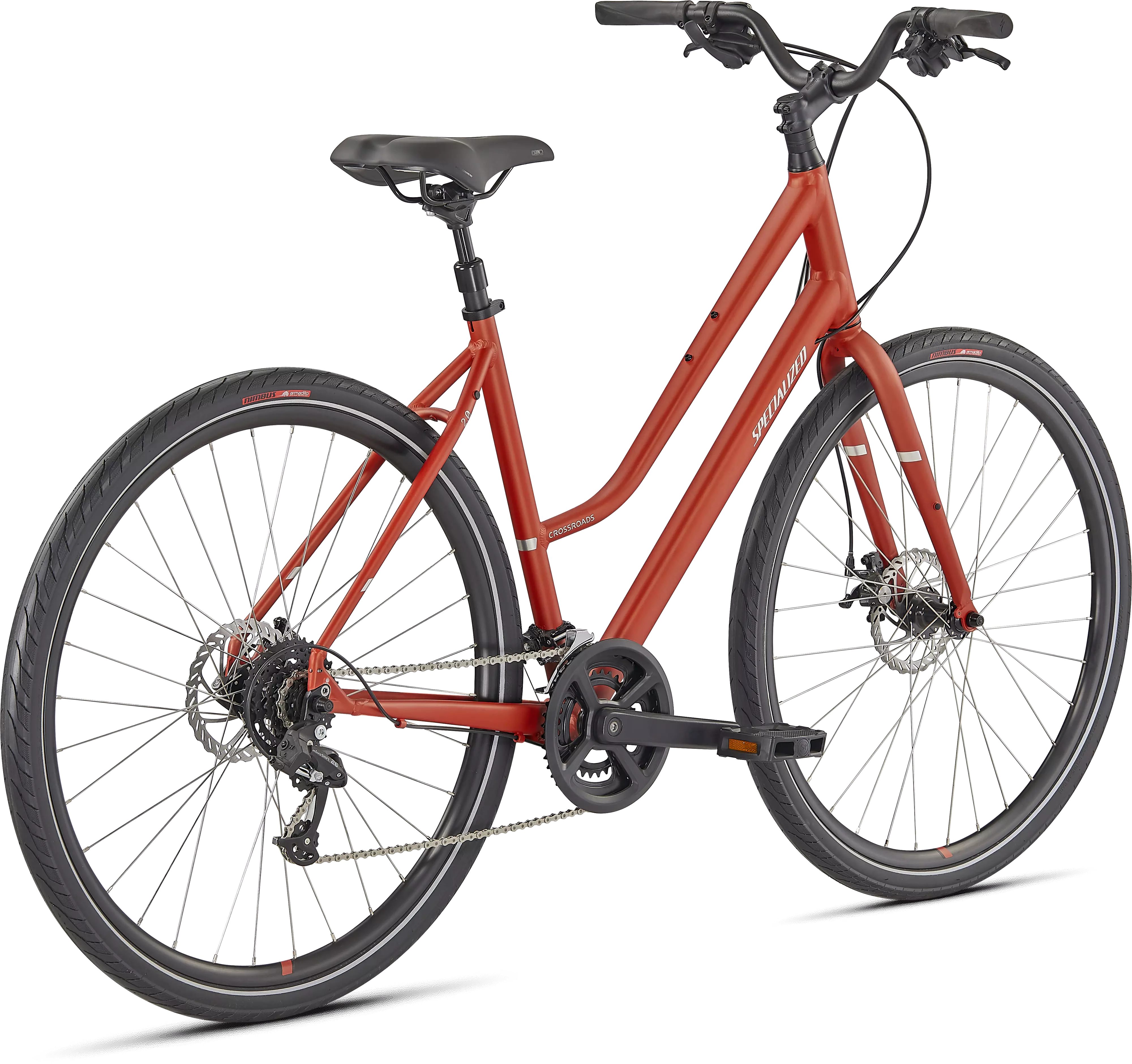 The Crossroads is your companion to a better, fitter, and happier you—whether it be along the road or dirt path. It features a comfortable, upright geometry with a step-through design that makes it easy to put a foot down at a stop, and reflective elements that increase your visibility to motorists in low-light conditions.