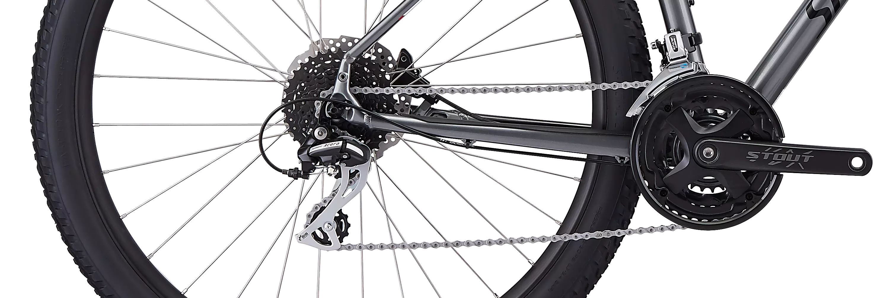 A Shimano Acera rear derailleur controls the rear shifting with durable aplomb. It shifts along a wide gear range, 11-34t, so you can ride confidently knowing that you'll always have the right gear for the hill at hand.