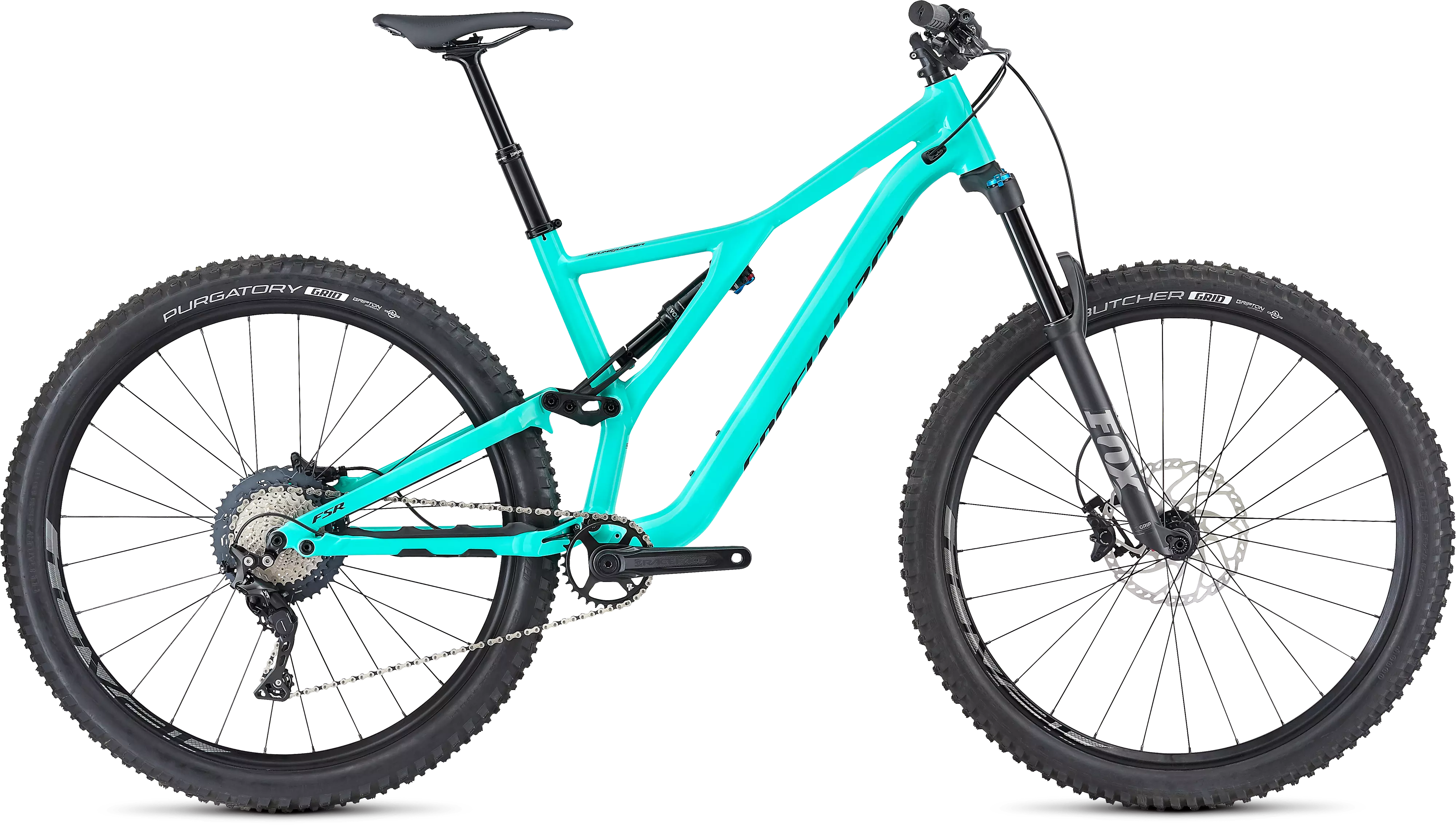 The build here is no-nonsense with a focus on dependable, high-performing parts, like a Shimano SLX drivetrain with RaceFace cranks, Shimano SLX disc brakes, FOX front and rear suspension, and Roval Traverse 29 alloy wheels.