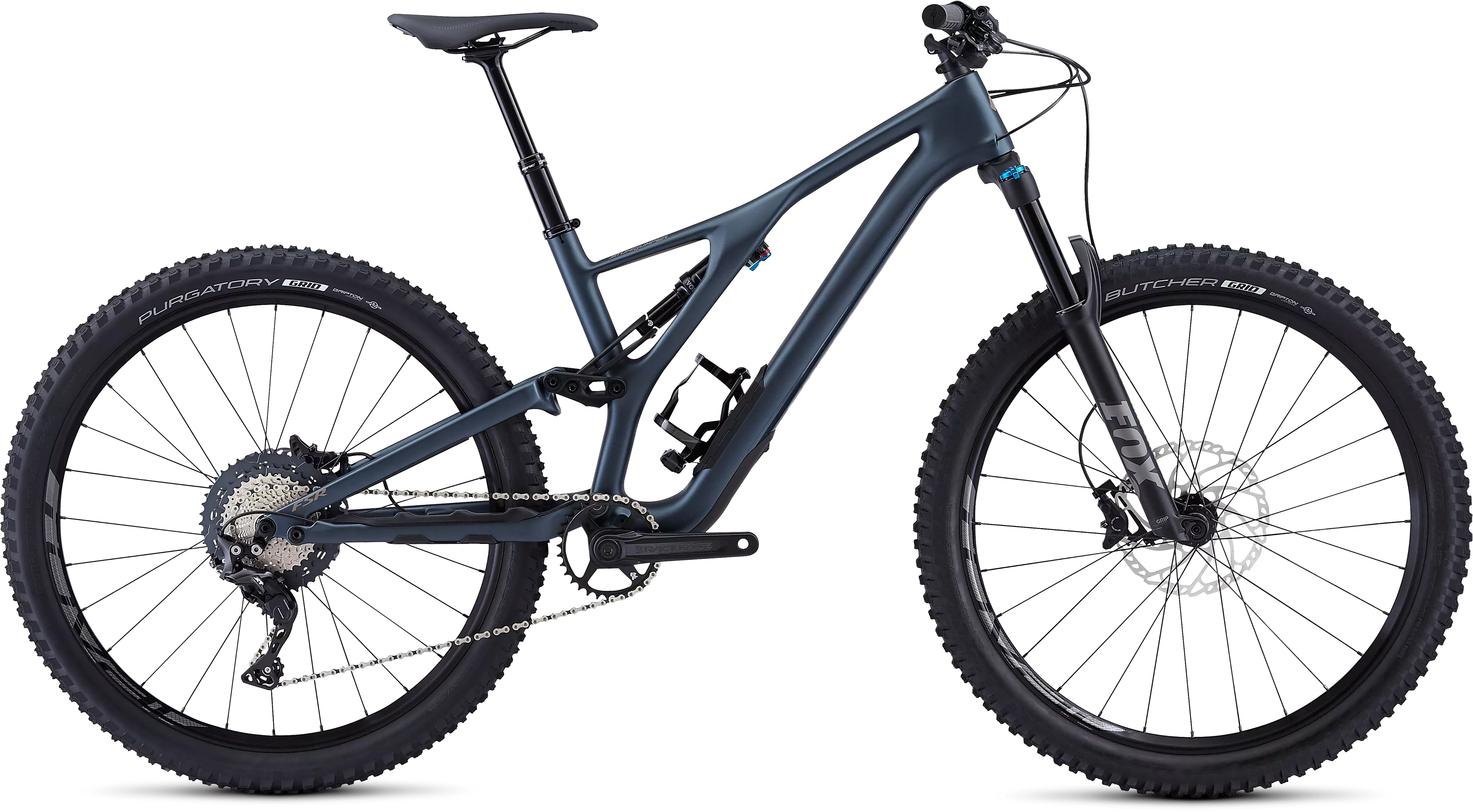 The build on this Comp model comes with a list of components that deliver undeniable quality, like a Shimano XT/SLX drivetrain with RaceFace cranks, Shimano SLX disc brakes, a FOX FLOAT Rhythm 34 for with 130mm of travel, a FOX FLOAT DPS rear shock with 130mm of travel, and Roval Traverse 27.5 wheels.