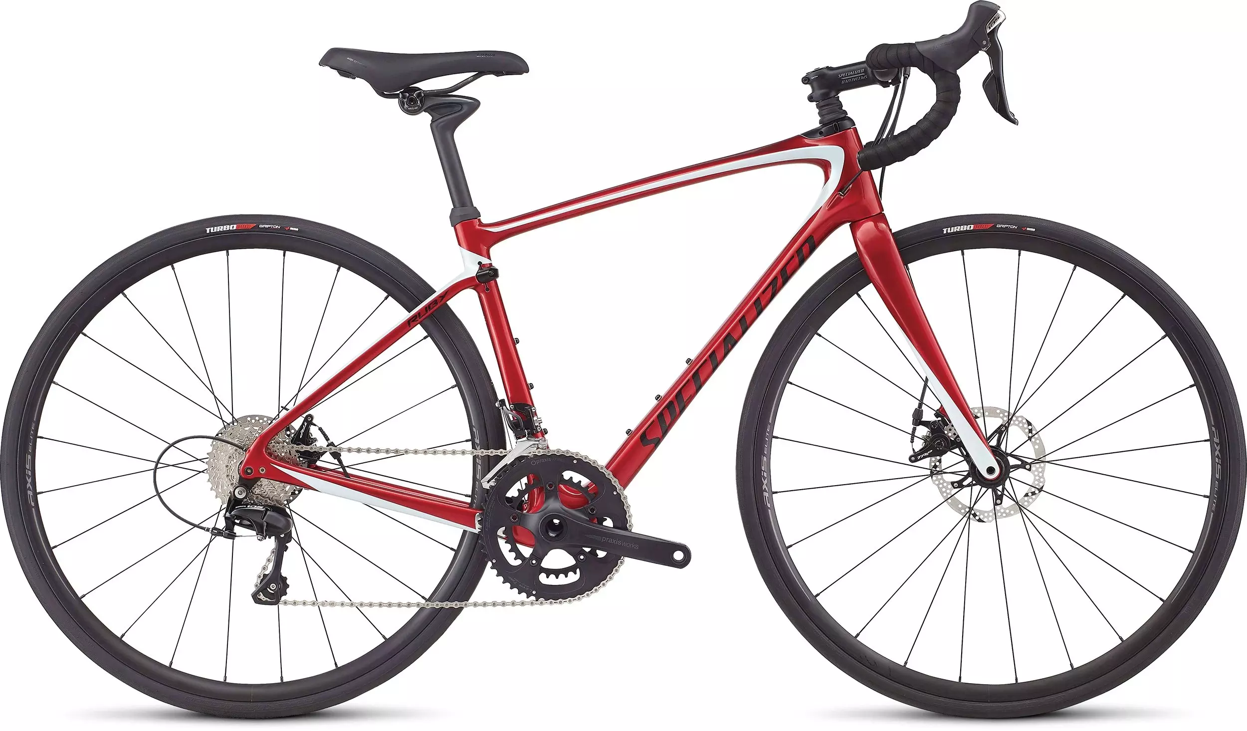 Who said that performance and comfort don't mix? It sure wasn't us, because our all-new Ruby Elite combines the two in one seamless, unprecedented package. The frame is among the lightest that we've ever made, and it's been constructed from our superlative FACT 10r carbon fiber. Its stiffness levels are also off the charts, and compared to the SL4 iteration of yesteryear, you'll experience a whole new, faster, and more efficient geometry. Through some engineering sorcery, however, we've managed to keep the same fit, feel, and position that we've all come to love from the SL4's Women's Endurance Geometry. Of course, you're probably thinking, "get on to the suspension thing up front." We call it Future Shock, and essentially, it's a piston in the head tube with 20mm of travel. We developed this technology in partnership with McLaren Applied Technologies, and the result of this are a host of drastic performance improvements, namely in the vertical compliance department. Without giving a physics lecture, we found that focusing on vertical compliance, instead of fork splay, meant that we could improve smoothness, speed, and comfort in one fell swoop. And of all the bikes that we've tested with our Rolling Efficiency Model, the new Ruby outperforms anything on the market. Lastly, we spec'd it with awesome components, like Shimano 105 shifting, hassle-free mechanical disc brakes, and a women's-specific saddle.