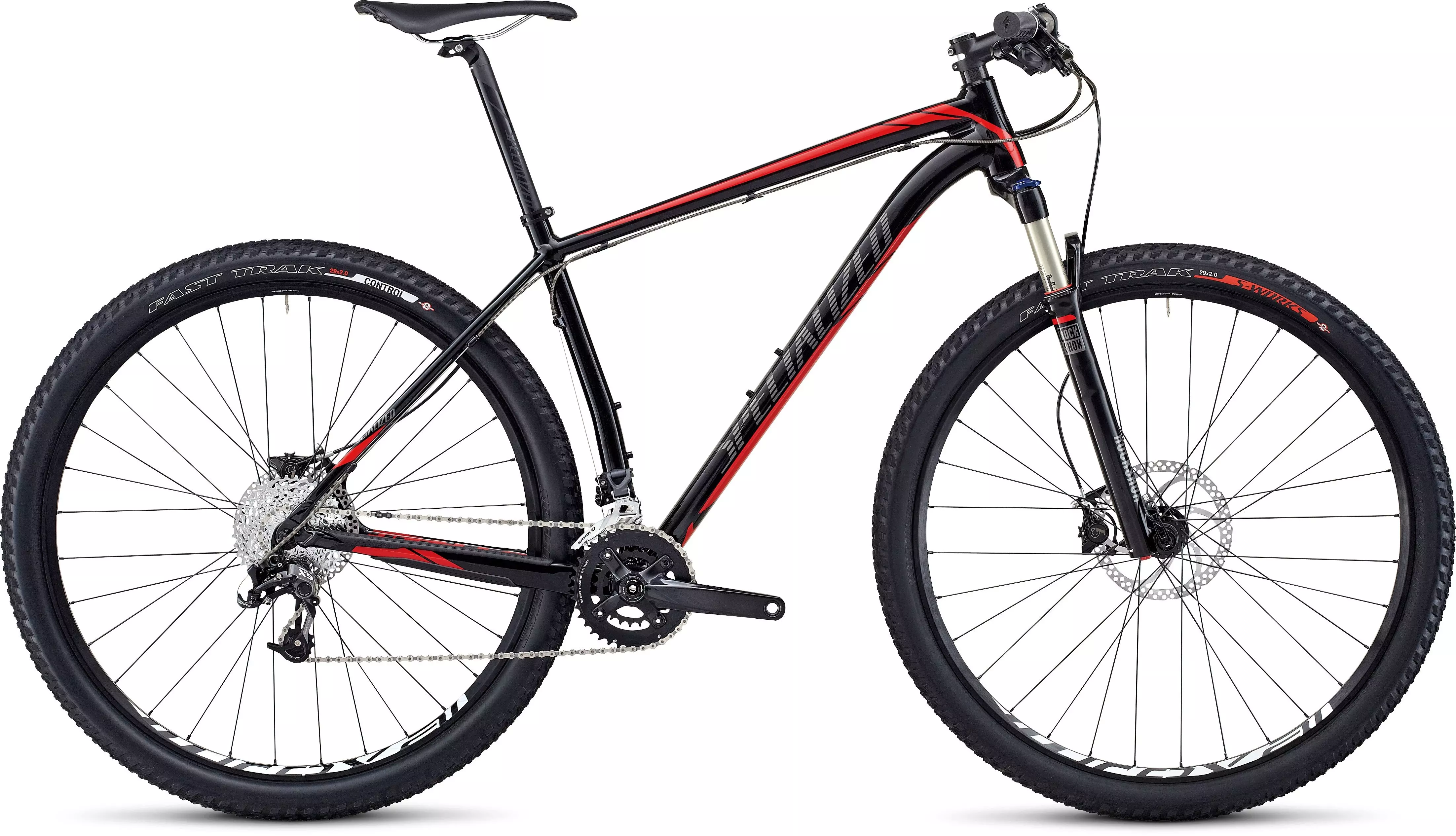The aluminum Stumpjumper HT Comp 29 features an 80mm-travel RockShox Reba fork with rebound and lockout adjustment and a custom SRAM 2x10 crankset.