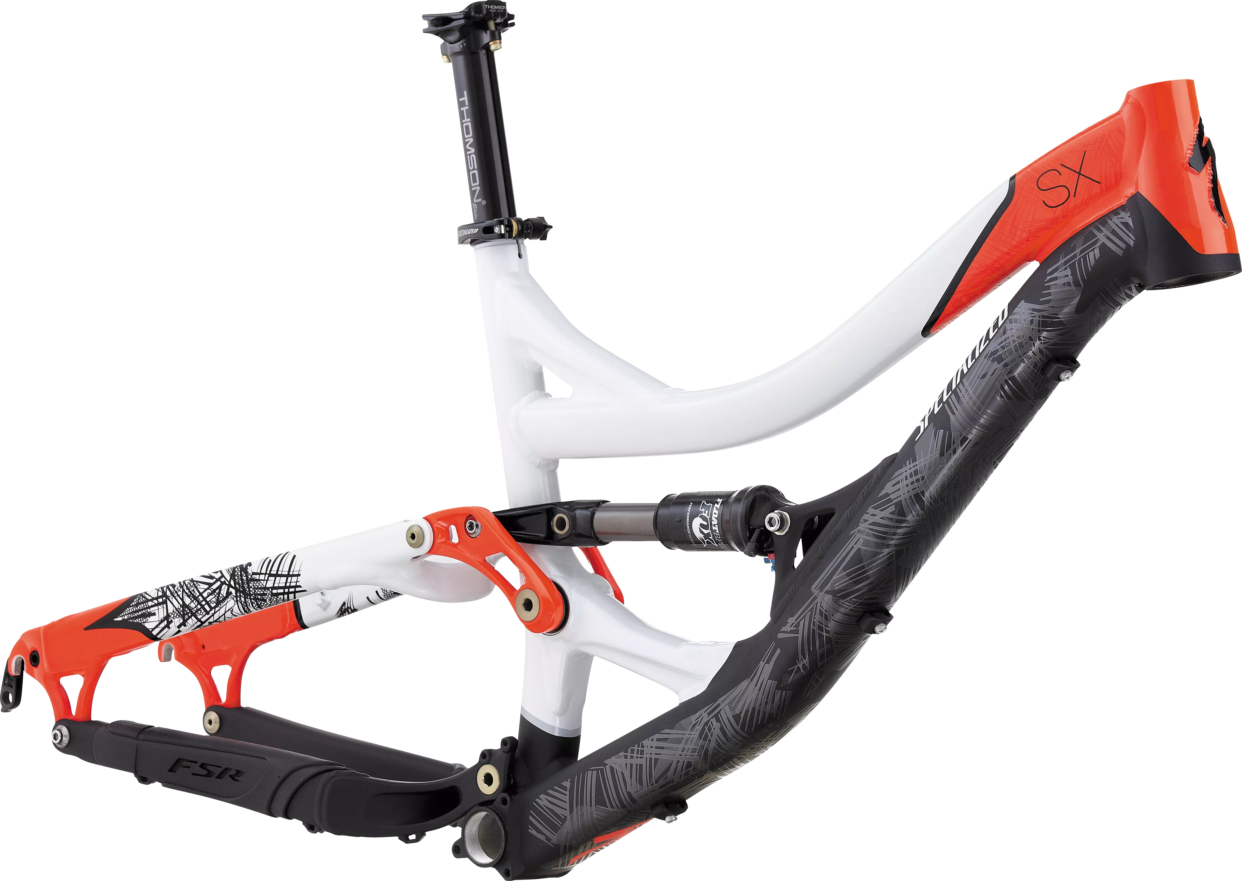 Designed for dual slalom racing, but is also at home riding slopestyle courses, the 100mm-travel SX frame is built for going fast and catching air. It's equipped with a Fox RP23 air shock.