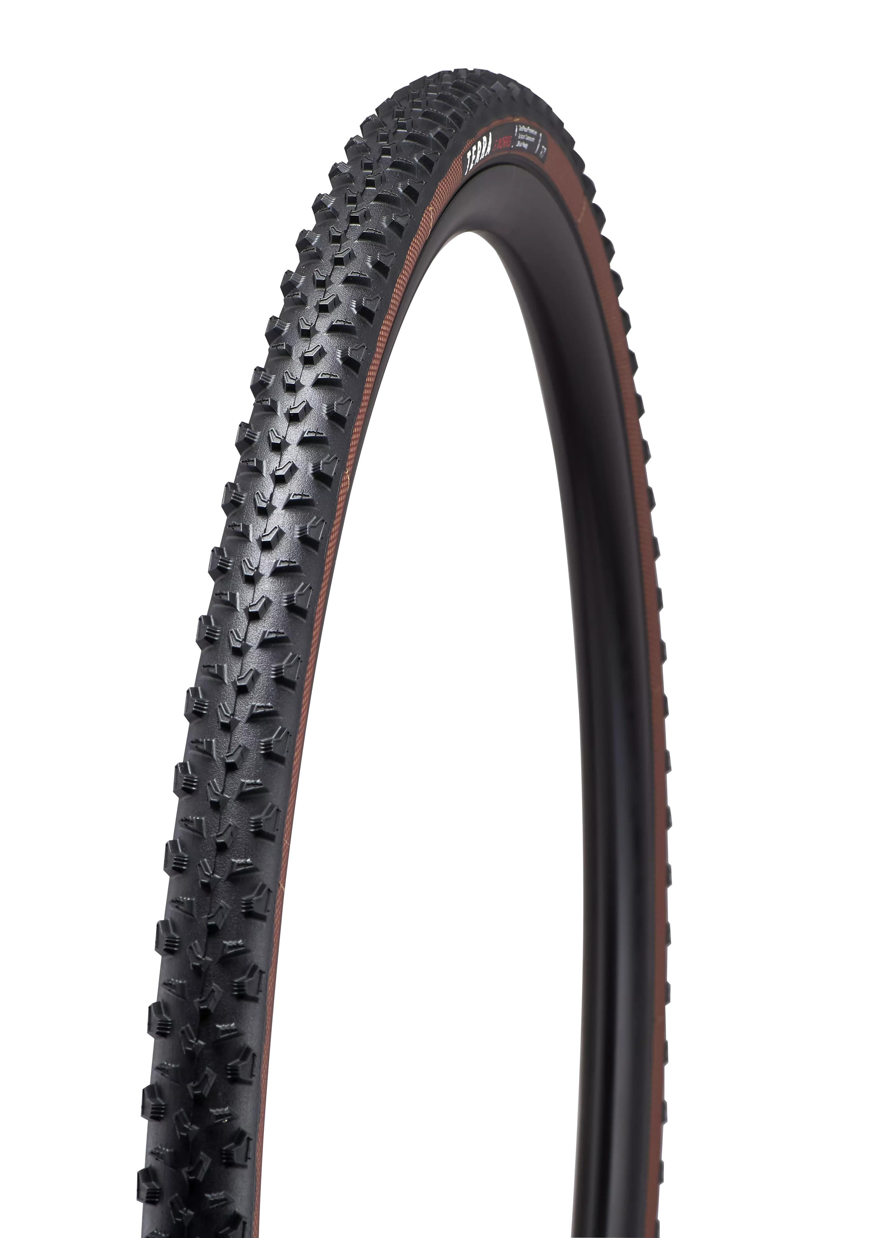 The new tubeless-ready S-Works Terra is made for CX racing in muddy conditions and spec’d with a light and supple 120 TPI casing with grippy T7 GRIPTON® compound. This rubber grips in all course conditions and will give you confidence on every race lap. The new GRID RACE sidewall protection is a lightweight cross-woven polyamide mesh, which is tear- and puncture-resistant but still very elastic for a supple ride. GRID RACE provides the best combination of protection, low weight, and speed, all while maintaining a responsive feel. A strong bead holds to the rim at low tire pressures, and the tire cross-section is designed to meet the UCI rule of 33 mm on a wide modern rim shape.